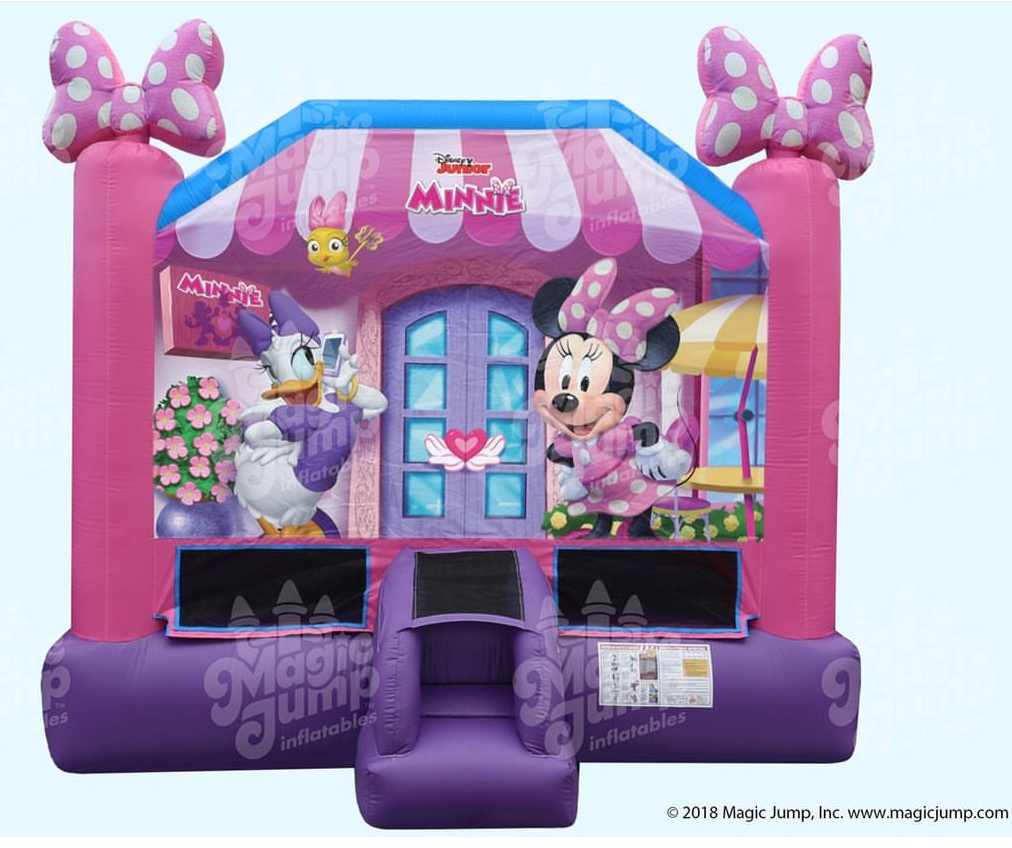 Be a happy helper with Minnie Mouse and Daisy Duck at the Happy Helper Headquarters with MINNIE MOUSE 15' x 15' bounce house. The beautifully colored purple and pink bounce house has plenty of space for up to 6 Happy Helpers at a time to bounce and jump all they want.