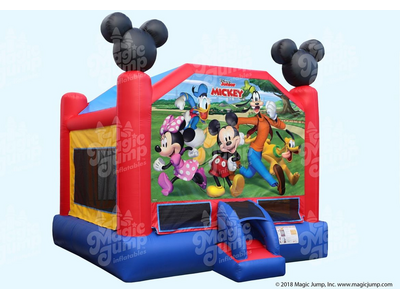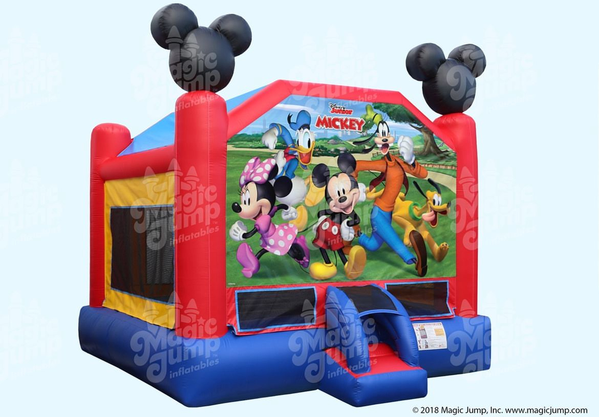 Come along with Mickey and Friends on a fun adventure with MICKEY AND FRIENDS 15' x 15' bounce house. Mickey Mouse himself greets everyone as they enter the bounce house. The rest of his friends Minnie, Goofy, Donald, and Pluto are there two smiling, ready to have a great time. The iconic Mickey Mouse ears are at the tops of the vertical pillars in the front of the bounce house. The bounce house designed in red, blue, and yellow colored vinyl, invites everyone to have a great time. There is plenty of space for up to 6 best pals at a time.