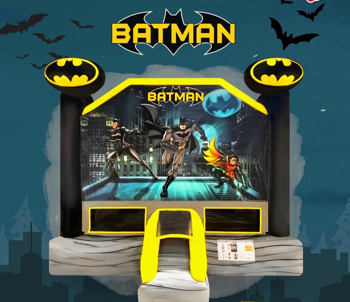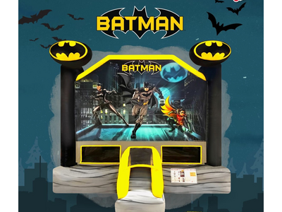 Join the Dark Knight in an action packed mission with the Large Batman Bounce house. This inflatable lets kids step into the world of Gotham City, featuring digital artwork of Batman, Robin and Catwoman chasing crime. It also features the iconic Bat signal emblems on the front vertical pillars. This bouncer features a spacious bounce area. Whether hosting a superhero-themed party or just looking to add excitement to any event, this Batman bounce house brings hours of entertainment.